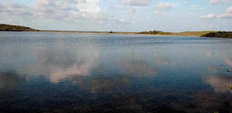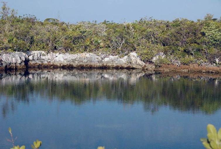 to the extensive “swiss cheese limestone” outcrops along much of its shoreline,