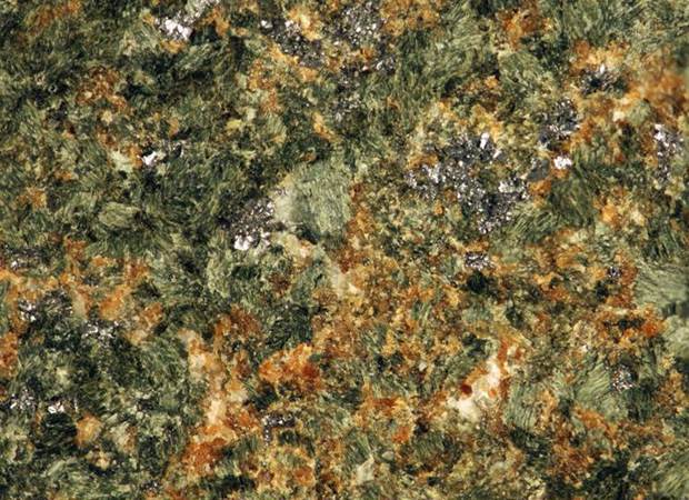 (reddish brown), diopside pyroxene (dark green), molybdenite (silver),