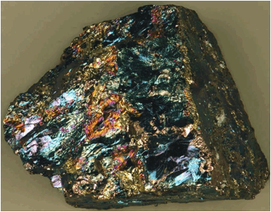 Tarnished chalcopyrite (CuFeS2) (2.5 cm tall) from the Sudbury Impact Crater in
