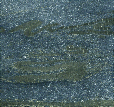 Dull brassy wisps = pyrrhotite (Fe1-xS)