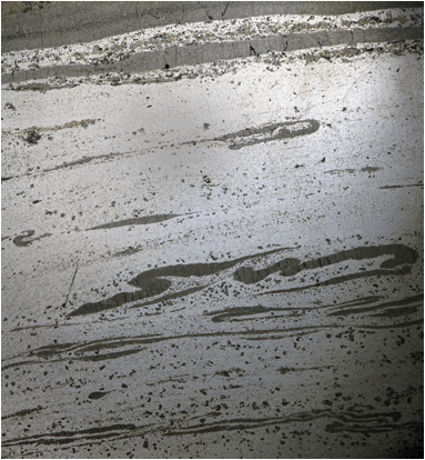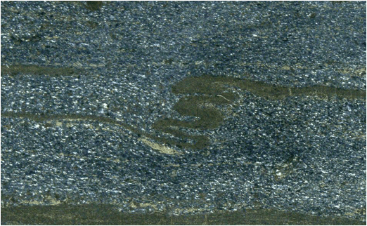 bedding seen in the sulfide layers formed by soft-sediment slumping.