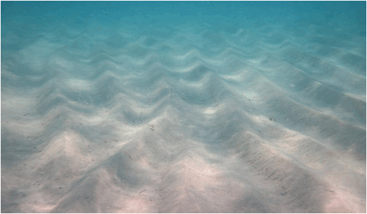 Symmetrical ripples (above & below) developed in biogenic, aragonitic
