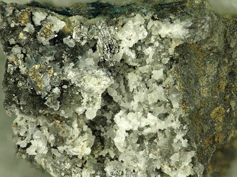 Tellurium (= silver-colored mass at top-center) (field of view 2.7 cm across) in