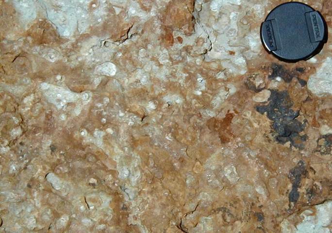 Skolithos linearis burrows (plan view - small circular structures; lens