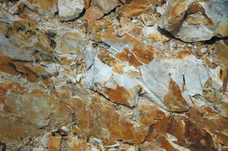 megaquartz-filled fractures. The brownish, rough-textured areas at the