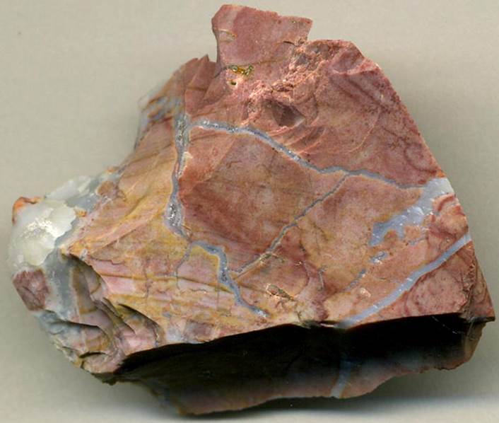 bottom) with prominent bluish-gray chalcedony-filled fractures.