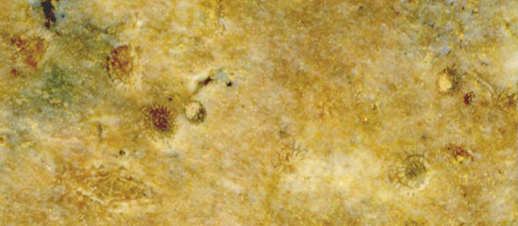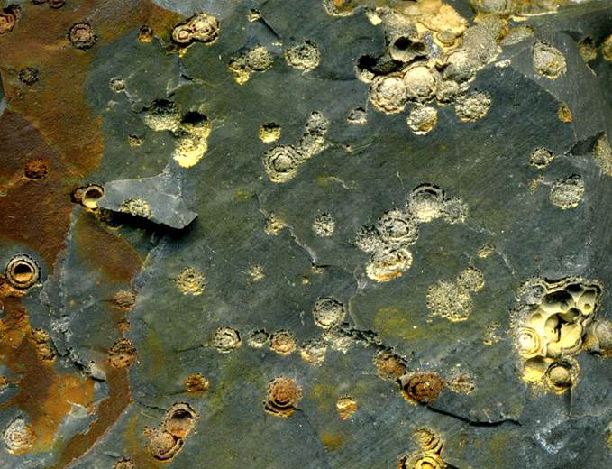 cavities. The dark reddish, dark brownish, and dark bluish-gray are