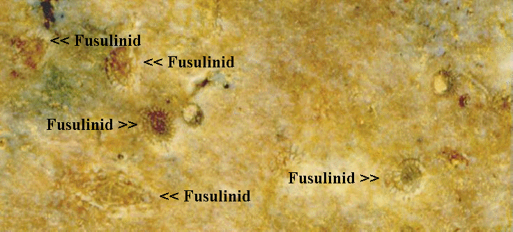 & below) - fusulinid foraminifera in flint. Fusulinids are one of
