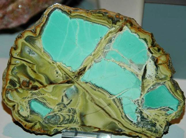 Variscite (blue-green) in polished nodule from the Clay Canyon Mine, Utah