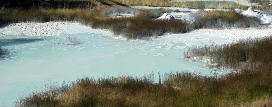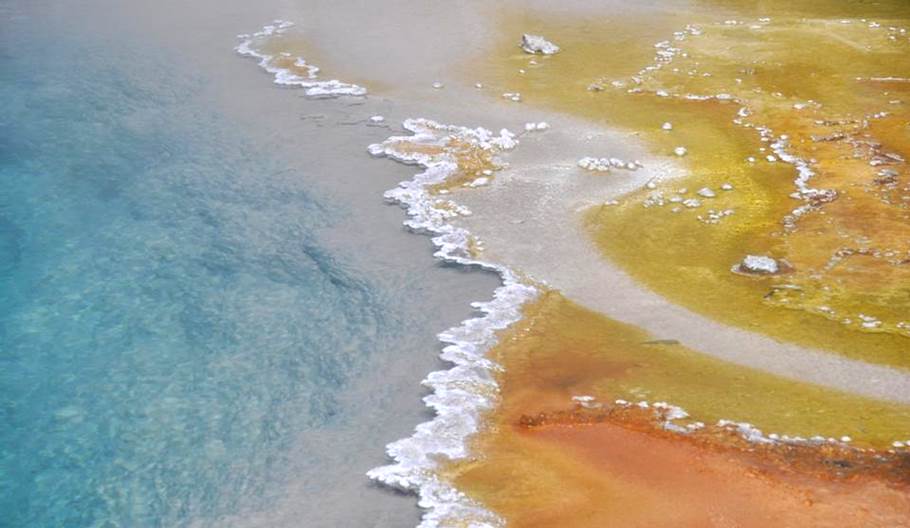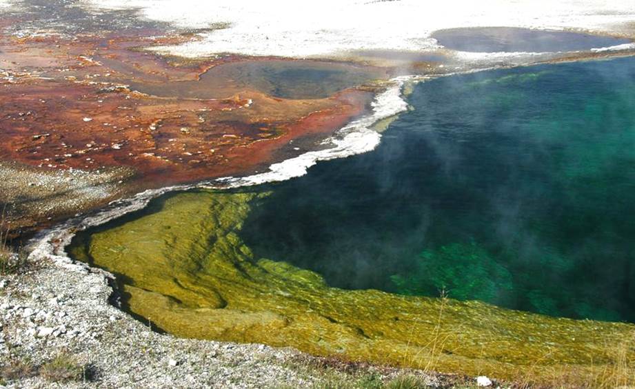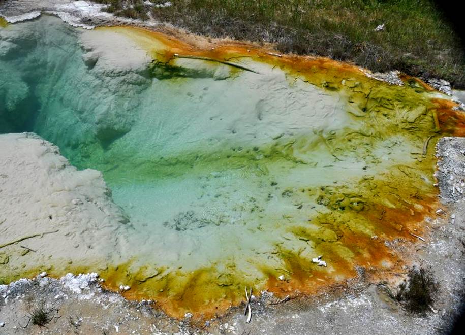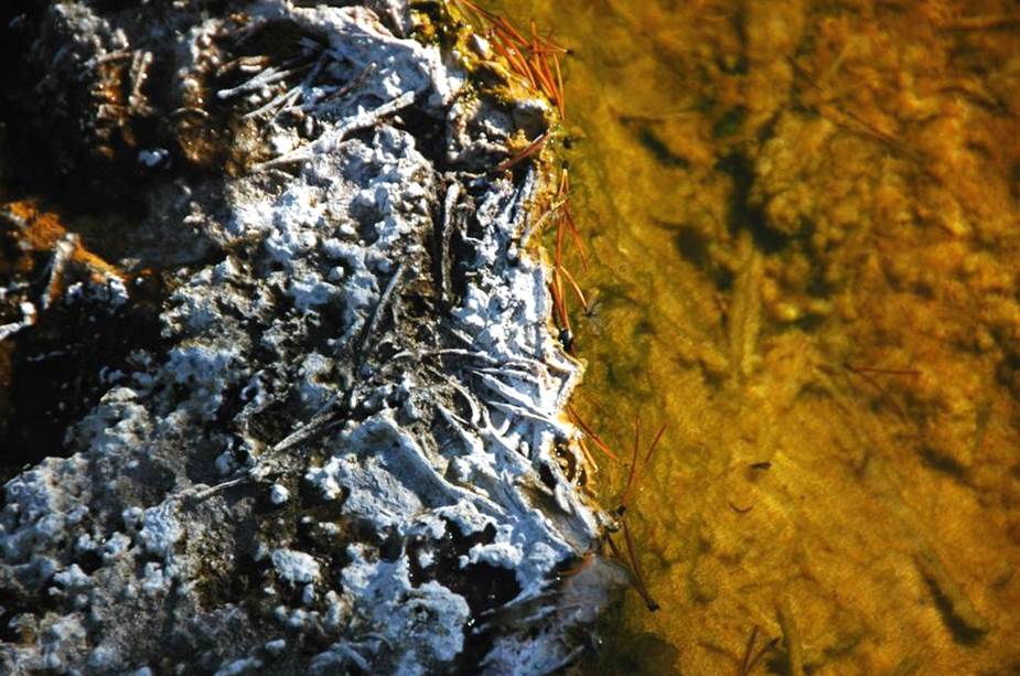 from the presence of yellowish extremophile bacterial mats on the pool walls