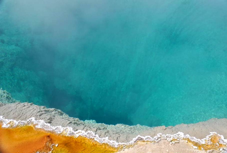 extremophile bacterial mats lining most of the pool’s walls. The “blue” water plus the yellowish-colored