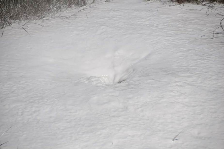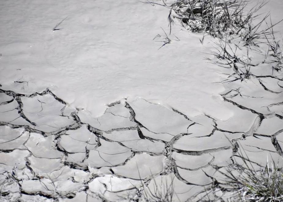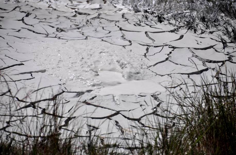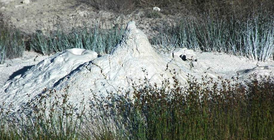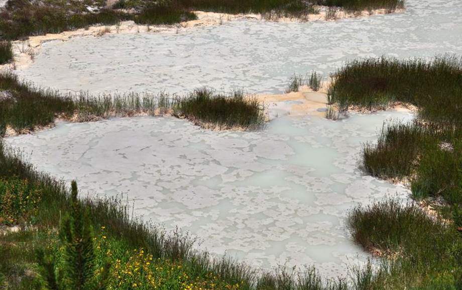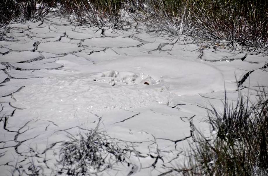 partially foam-covered, irregularly shaped pools, small mud volcanoes, small