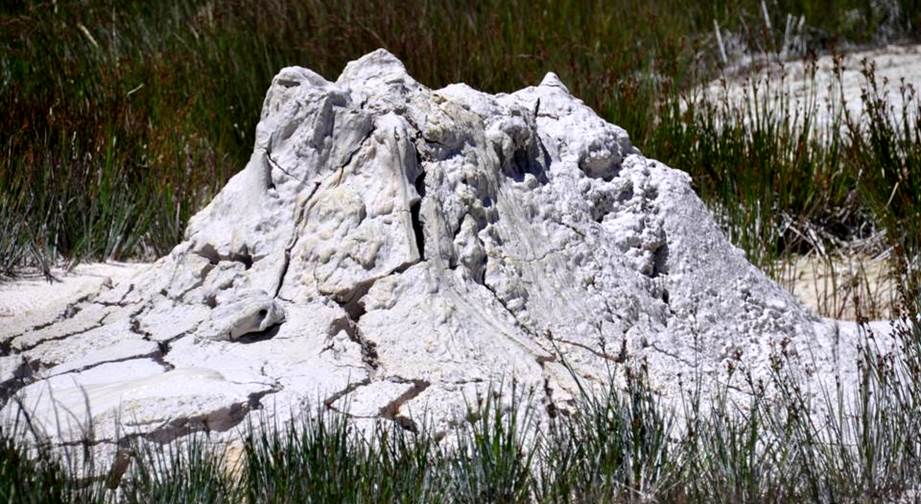 easily examined along the lakeshore adjacent to tourist boardwalks. Geyserite is composed of opal (SiO2·nH2O